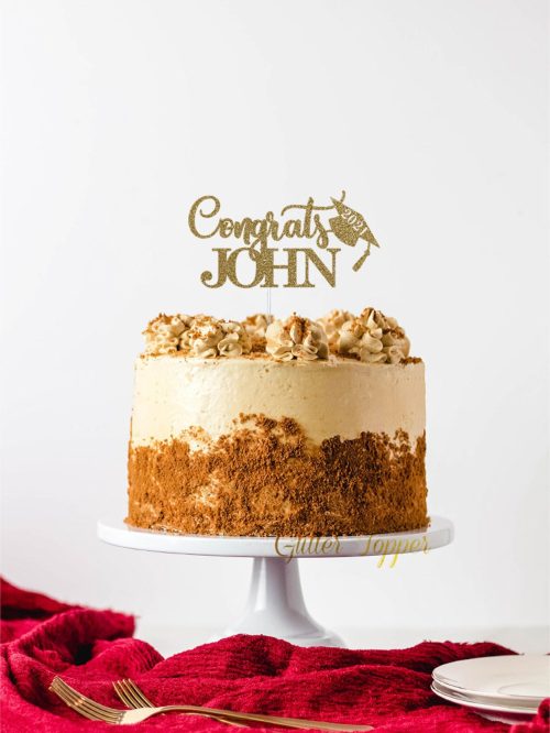 The congratulations decoration on the cake is a gold “Congratulations!” cake topper – but it’s not customizable to include the recipient’s name.