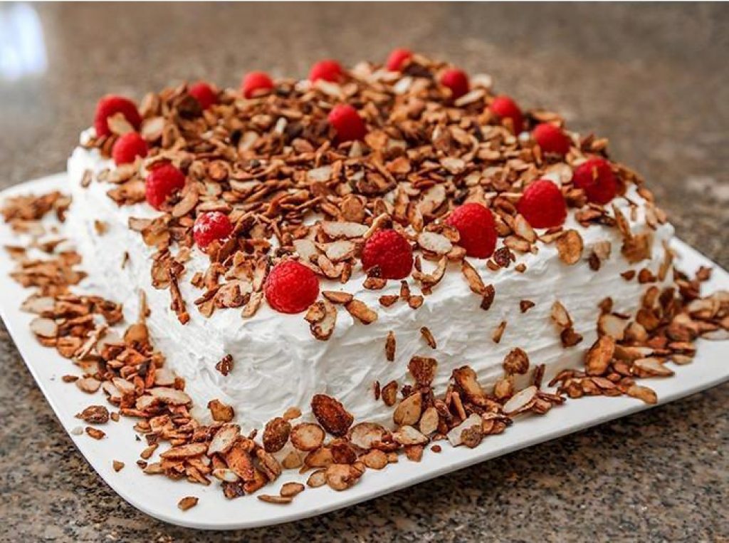Each layer is filled with French Crème Chantilly (light vanilla whipped cream) and fresh juicy raspberries. The Champagne Vanilla Cake is finished with a sprinkling of toasted almonds – tasted ‘en flambé’ in Amaretto liqueur.