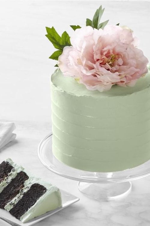 On top, the bakers added mint buttercream and a decorative silk peony.